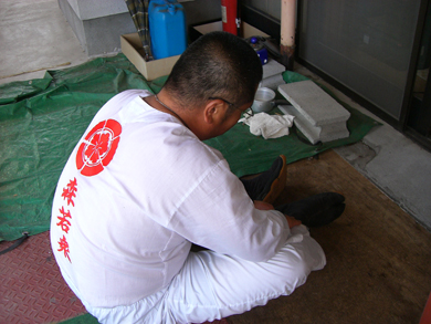地下足袋と脚伴の装着に悪戦苦闘している所をパチリ
