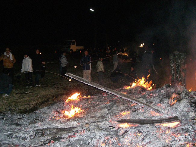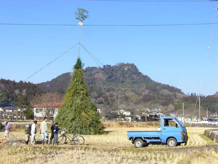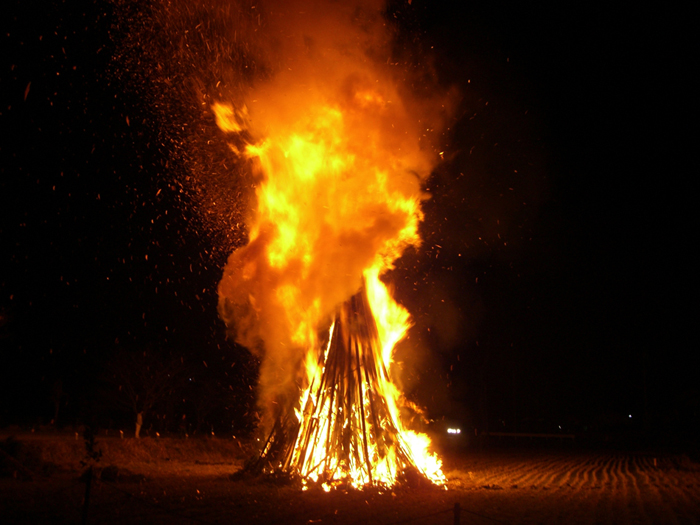 竹を100本以上使い組み立てられていて、焼ける時に独特なバチバチと大きな音をたて燃え上がり迫力がありました。地元の噂によると真ん中に有る『芯竹』が倒れた方向より吉兆が訪れると云われており、今年は北へ倒れました。倒れた芯竹は火事除けや無病息災の意味があり一部を持ち帰り神棚(荒神様)に一年間祠うと良いそうです。
