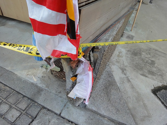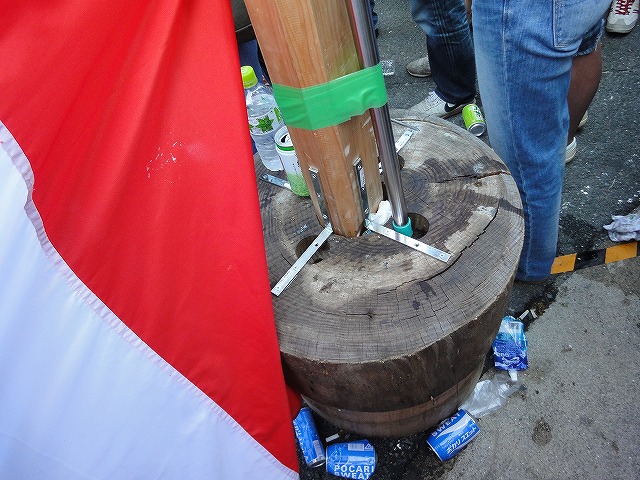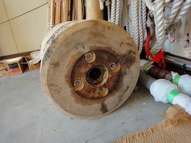 使用済みのこま(車輪)を支柱の重し代わりに再利用してました